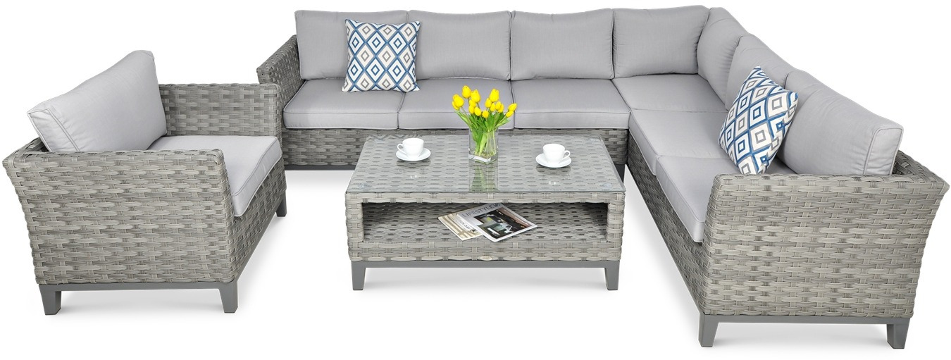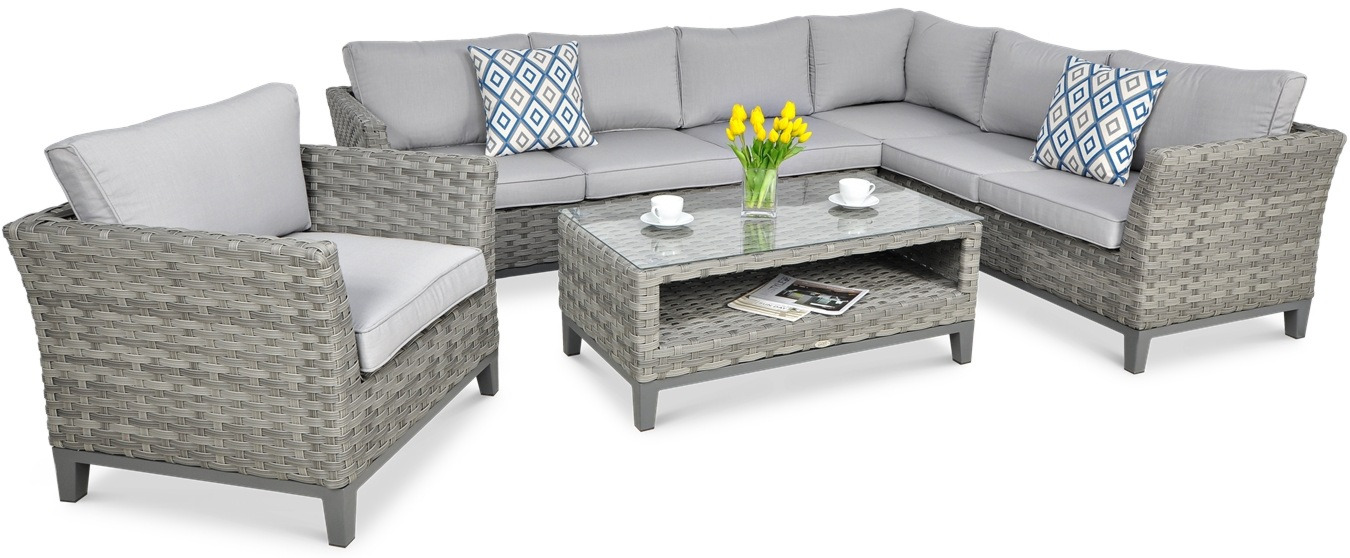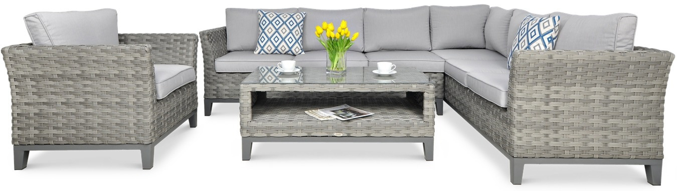 Комплект Malaga Caffe Modern Grey з кутовим диваном, кріслом і кавовим столиком сподобається клієнтам, які вимагають безкомпромісної якості та елегантності. Садові меблі з цього комплекту відмінно підійдуть для домашніх умов, а також для підприємств HoReCa.